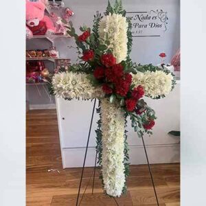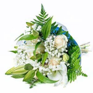 Show your sympathy with this classic white pompom, daisy spray and seasonal greenery wrapped in paper.