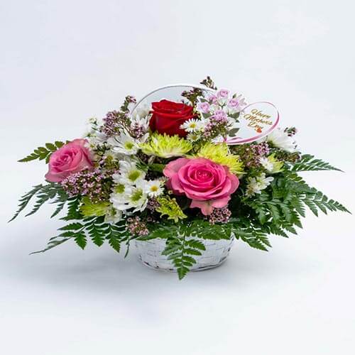 Charming medium-sized basket with different shades of roses, accompanied by pompom, wax flowers, and our beautiful green foliage.