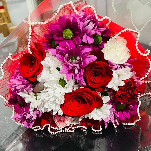 Our mixed bouquet with many different colors. Includes our lovely roses and our pompoms