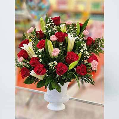 An elegant and timeless display of lilies, classic roses and delicate carnations shows a sophisticated mixture of shapes, all nestled in lush greenery and gysophila whitin a vase.
