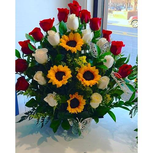 A mix of white and red roses, sunflowers, accented with fresh ruscus and seasonal greenery.