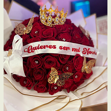 We offer a bouquet section starting from 50 premium rose, decorated with small pearls or rhinestones, also featuring a crown with butterflies on top, and wrapped with korean paper.